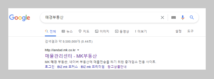 위 화면은 구글에서 '매경부동산'을 검색한 결과입니다. 길고 복잡한 검색어를 입력할 필요 없이 '매경부동산'만 검색하면 됩니다. 네이버나 다음에서도 동일한 결과를 보여줍니다. 원하는 포털을 선택하시면 됩니다.