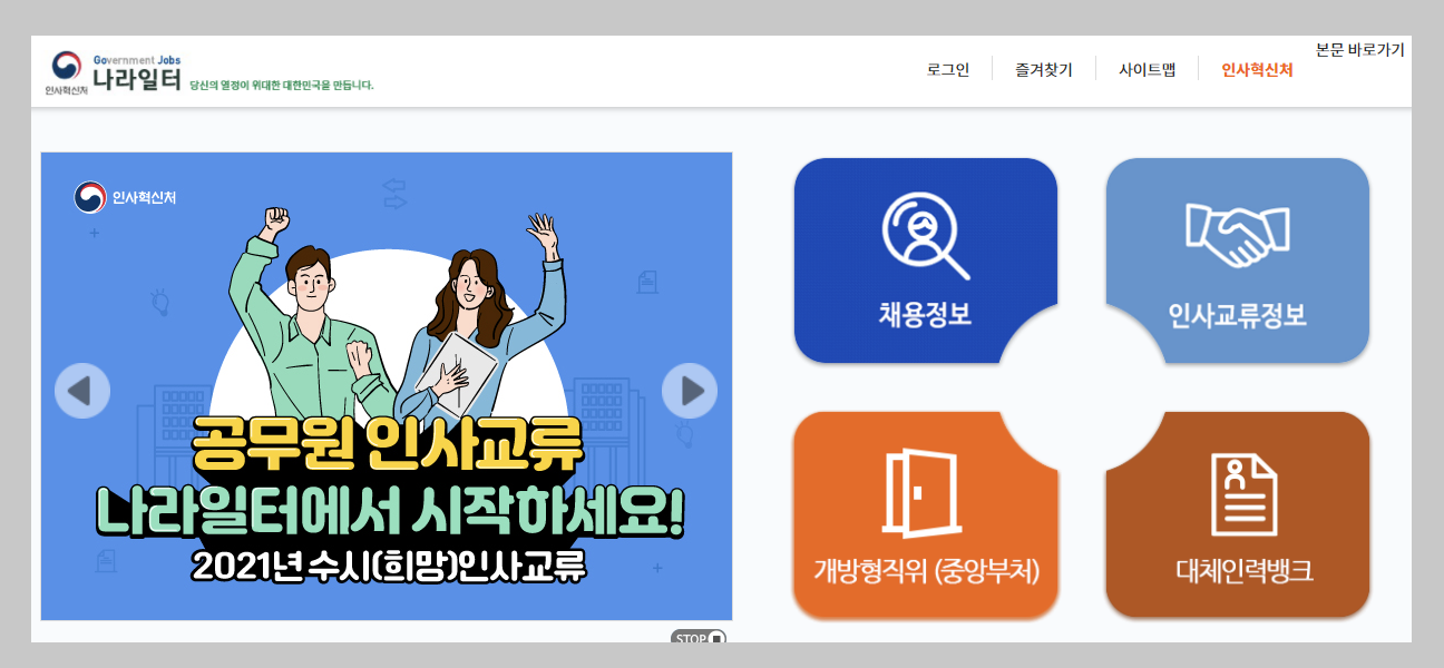 나라일터는 2008년부터 시작된, 공무원 채용 및 인사교류를 위한 종합 온라인 시스템으로, 중앙정부와 지방정부, 공공기관 등 다양한 공직 채용 정보를 폭넓게 제공한다. 이 시스템은 직장을 구하는 공무원뿐 아니라, 정부 각급 기관간의 인사교류를 원하는 이들에게 큰 도움이 된다. 나라일터의 가장 큰 장점은 공신력이다. 이 시스템은 중앙정부가 직접 운영하는 만큼, 목록에 등록된 일자리는 신뢰할 만하다. 또한, 공무원 채용 정보뿐 아니라 대체 인력 채용 및 개방형 직위 공고도 제공하여, 다양한 공직 채용 정보를 한 눈에 확인할 수 있다.